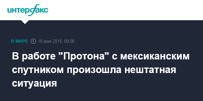 Москва. 16 мая. INTERFAX.RU - Во время запуска мексиканского спутника связи MexSat-1 с помощью ракеты "Протон-М" на 500-й секунде полета возникла нештатная ситуация, сообщил диктор во время репортажа о пуске.