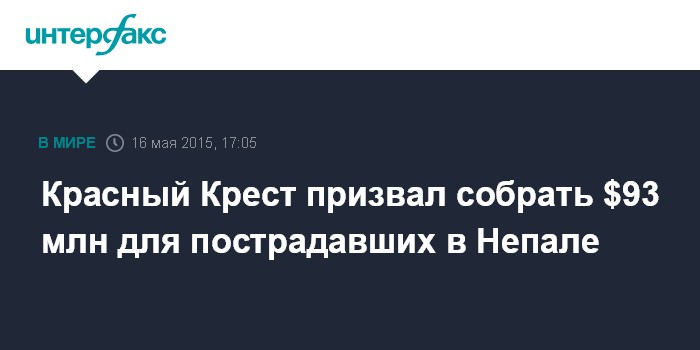 Москва. 16 мая. INTERFAX.RU - Международное общество Красного Креста и Красного Полумесяца обратилось к мировому сообществу с призывом собрать $93 млн, которые необходимы Непалу на преодоление последствий серии мощных землетрясений.