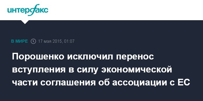 Москва. 17 мая. INTERFAX.RU - Президент Украины Петр Порошенко в ходе субботней встречи с депутатами Верховной рады, входящими в межфракционное объединение "Еврооптимисты", подчеркнул, что дата вступления в силу экономической части Соглашения об ассоциации с Евросоюзом переносится не будет.