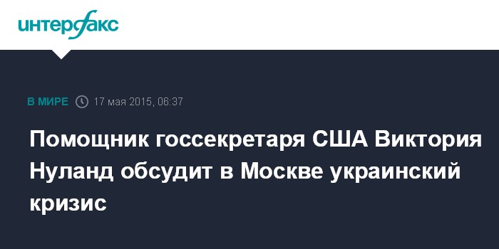 Москва. 17 мая. INTERFAX.RU - Помощник госсекретаря США Виктория Нуланд посетит Россию 17-18 мая и обсудит вопросы, связанные с реализацией минских договоренностей по Украине, сообщает американский госдепартамент.