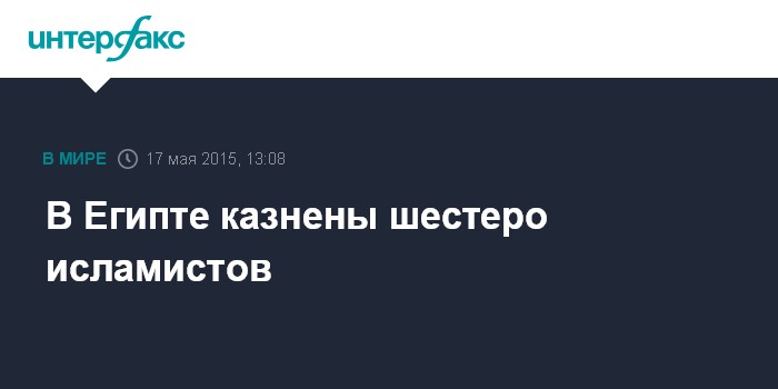 Москва. 17 мая. INTERFAX.RU - Египетские власти привели в исполнение вынесенный военным трибуналом смертный приговор шестерым исламистам, сообщили СМИ из Каира.