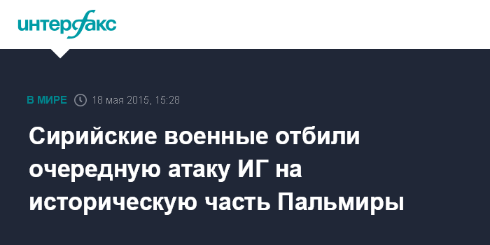 Москва. 18 мая. INTERFAX.RU - Военнослужащие армии Сирии в понедельник отбили атаку боевиков из ИГ на старую часть города Пальмира, сообщает агентство EFE.