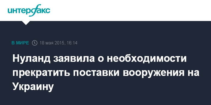 Москва. 18 мая. INTERFAX.RU - Поставки вооружений всем сторонам конфликта на территории Украины должны быть прекращены, но пока в США этого не видят, заявила помощник госсекретаря США Виктория Нуланд.