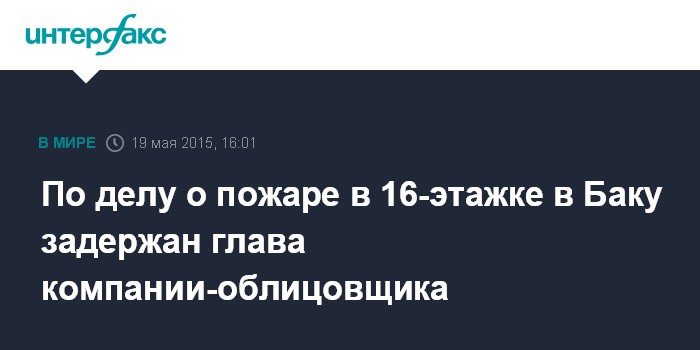 Москва. 19 мая. INTERFAX.RU - Правоохранительные органы задержали главу компании, занимавшейся облицовкой жилого многоэтажного дома в Бинагадинском районе Баку, в котором во вторник в результате пожара погибли 16 человек, сообщает пресс-служба Генпрокуратуры Азербайджана.