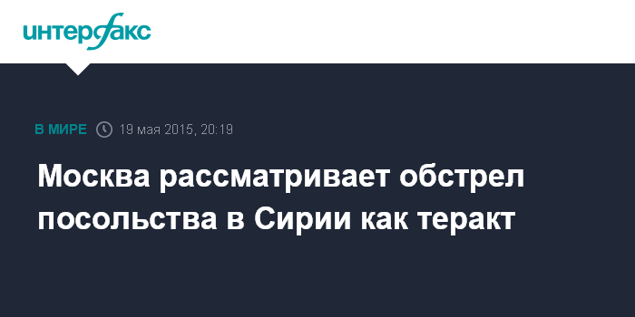 Москва. 19 мая. INTERFAX.RU - Москва рассматривает обстрел посольства в Сирии как теракт, решительно осуждает его исполнителей, организаторов и вдохновителей, сообщает МИД РФ, призывая мировое сообщество дать соответствующую оценку этой террористической атаке.