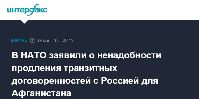 Москва. 19 мая. INTERFAX.RU - Транзитные договоренности НАТО с Россией по поддержке миссии в Афганистане истекли, когда закончилась операция Международных сил содействия безопасности (ISAF) 31 декабря 2014 года, заявила официальный представитель НАТО Оана Лунгеску.