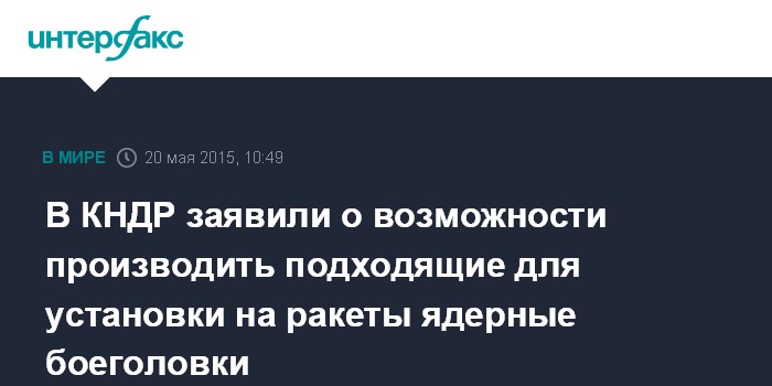 Москва. 20 мая. INTERFAX.RU - Власти КНДР объявили, что отныне располагают технологиями, позволяющими производить достаточно компактные ядерные боеголовки, подходящие для установки на ракеты, сообщает в среду южнокорейское агентство "Ренхап".
