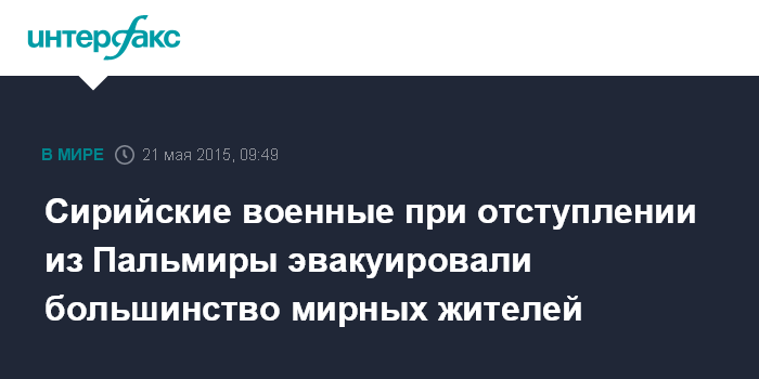 Москва. 21 мая. INTERFAX.RU - Военнослужащие сирийской армии, отступившие под давлением боевиков ИГ из древнего античного города Пальмира, успели провести эвакуацию большинства остававшихся там мирных жителей, сообщает в четверг BBC News.