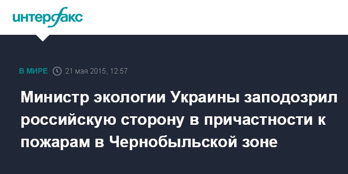 Москва. 21 мая. INTERFAX.RU - Одной из вероятных причин возникновения крупного пожара в зоне отчуждения вокруг Чернобыльской АЭС могла быть диверсия с российской стороны, считает министр экологии и природных ресурсов Украины Игорь Шевченко.
