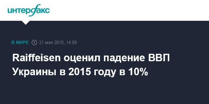 Москва. 21 мая. INTERFAX.RU - Raiffeisen Research прогнозирует ускорение падения валового внутреннего продукта Украины в 2015 году до 10% по сравнению с 6,8% в 2014 году, такие данные приведены в квартальном отчете Raiffeisen Bank International, обнародованном в четверг в Киеве.