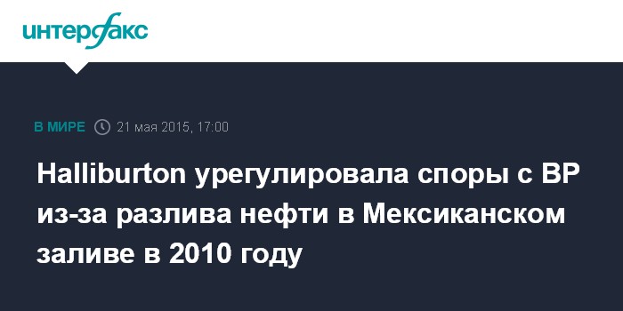 Москва. 21 мая. INTERFAX.RU - Нефтесервисная американская Halliburton и британская нефтедобывающая BP 20 мая подписали соглашение об урегулировании вопросов, возникших в результате аварии на нефтедобывающей платформе Deepwater Horizon в Мексиканском заливе 20 апреля 2010 года.