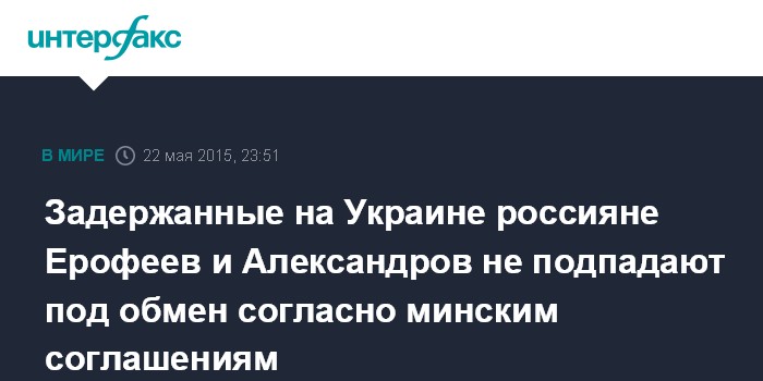 Москва. 22 мая. INTERFAX.RU - Задержанные в Луганской области граждане РФ Евгений Ерофеев и Александр Александров не подпадают под обмен в соответствии с Минскими соглашениями, отмечает переговорщик центра содействия освобождению заложников при СБУ Юрий Тандит.