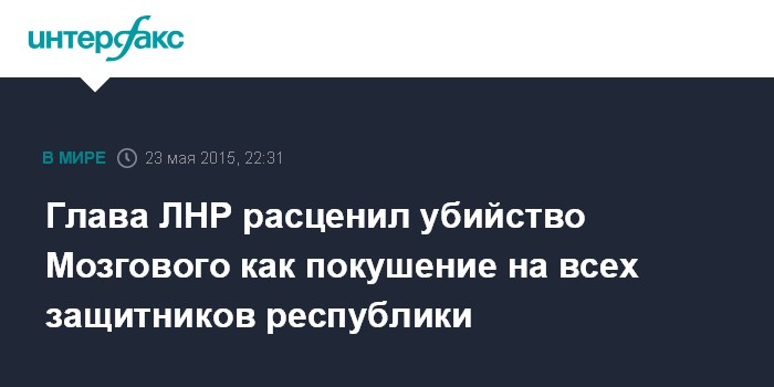 Москва. 23 мая. INTERFAX.RU - Глава самопровозглашенной Луганской народной республики (ЛНР) Игорь Плотницкий считает убийство командира батальона Народной милиции ЛНР Алексея Мозгового нападением на всех, кто защищает республику.