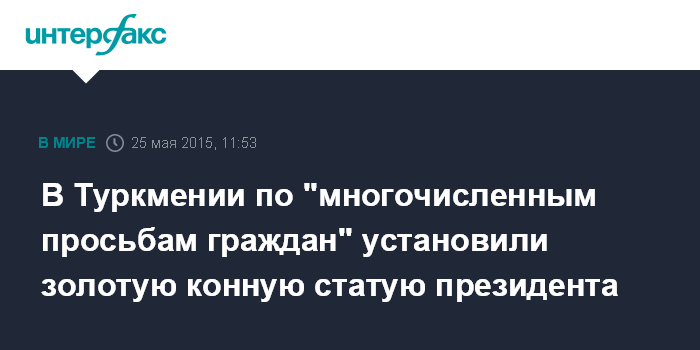 По ее данным, позолоченный памятник высотой 21 метр был торжественно открыт в Ашхабаде в День города. Монумент изображает главу государства верхом на ахалтекинском скакуне с высоко поднятой правой рукой.