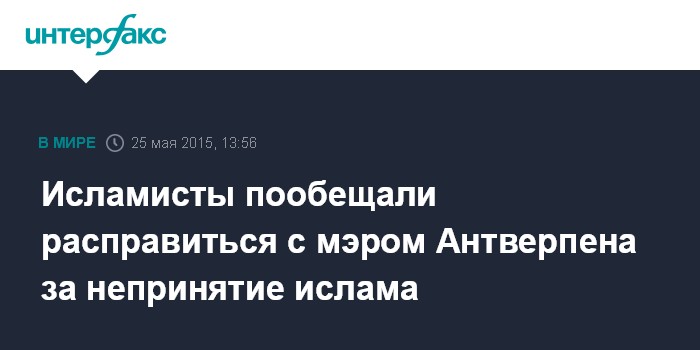 Москва. 25 мая. INTERFAX.RU - Мэр города Антверпен Барт де Вевер сообщил, что на его имя поступило письмо с угрозами исламистского толка, пишет бельгийская газета Soir.