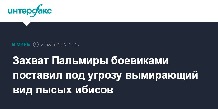 Москва. 25 мая. INTERFAX.RU - Захват сирийской Пальмиры боевиками из группировки "Исламское государство" (ИГ) мог полностью уничтожить сирийскую популяцию лысых ибисов, сообщает в понедельник BBC News.
