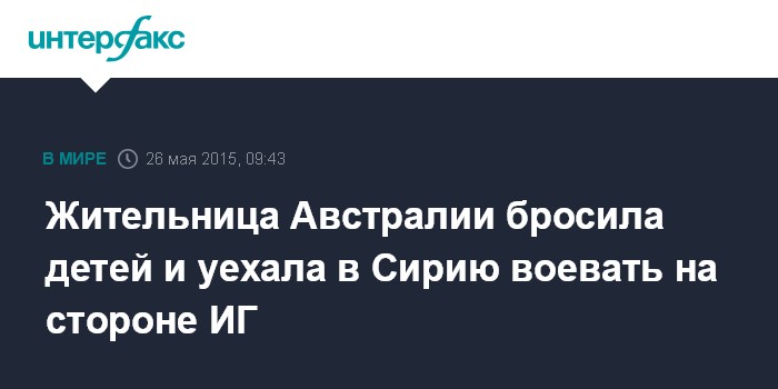 Москва. 26 мая. INTERFAX.RU - Жительница Сиднея оставила двух детей и уехала в Сирию, чтобы вступить в ряды боевиков "Исламского государства" (ИГ), сообщают во вторник западные СМИ.