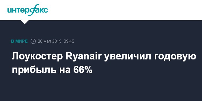 Москва. 26 мая. INTERFAX.RU - Ирландская Ryanair Holdings Plc, крупнейший в Европе авиаперевозчик-дискаунтер, в прошлом финансовом году, завершившемся 31 марта, увеличила чистую прибыль на 66%.
