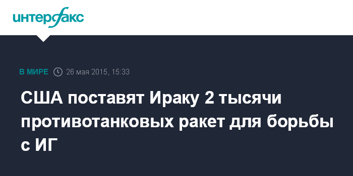 Москва. 26 мая. INTERFAX.RU - Вооруженные силы США намерены снабдить иракскую армию 2 тыс. противотанковыми управляемыми ракетами для борьбы с боевиками "Исламского государства", говорится в коммюнике, распространенном во вторник американским военным командованием.