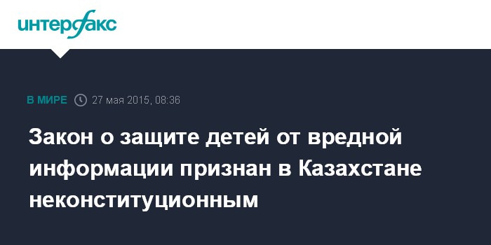 Москва. 27 мая. INTERFAX.RU - Конституционный совет (КС) Казахстана признал несоответствующим нормам Основного закона положение "О защите детей от информации, причиняющей вред их здоровью и развитию", принятый ранее парламентом республики, но еще не подписанный президентом.