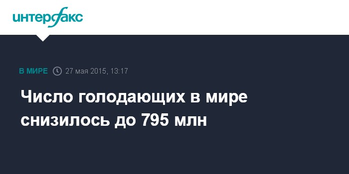 Москва. 27 мая. INTERFAX.RU - Число жителей Земли, страдающих от голода, за последнее время сократилось и составило около 795 млн человек, говорится в совместном докладе трех организаций под эгидой ООН.