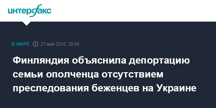 Москва. 27 мая. INTERFAX.RU - Департамент по делам миграции Финляндии считает, что бежавшие с востока Украины не нуждаются в приюте в Финляндии, так как на остальной территории Украины им ничего не угрожает.
