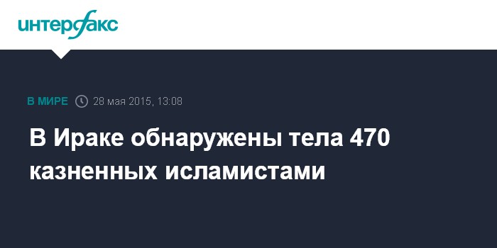 Москва. 28 мая. INTERFAX.RU - В иракском Тикрите обнаружены четыре места массового захоронения с останками 470 человек, которые, предположительно, были убиты мусульманскими радикалами в прошлом году, сообщает в четверг межарабский телеканал "Аль-Арабийя" со ссылкой на минздрав Ирака.