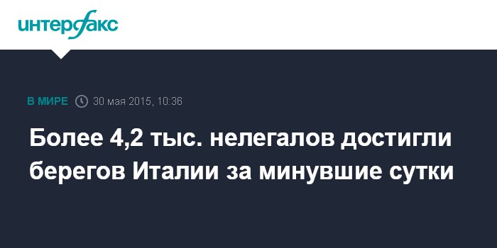 Москва. 30 мая. INTERFAX.RU - Итальянские ВМС пришли на помощь 4 тыс. 243 нелегалам около берегов своей страны, передает в субботу агентство EFE. При этом в ходе спасательных операций были обнаружены тела 17 погибших человек.