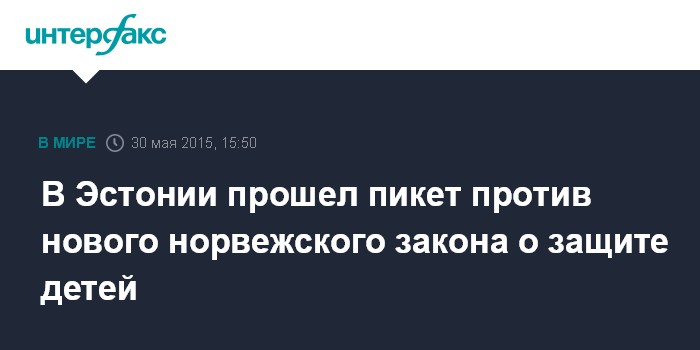 Москва. 30 мая. INTERFAX.RU - В Эстонии в субботу у посольства Норвегии прошел пикет против нового закона о защите детей, вступающего в силу с 1 января 2016 года.