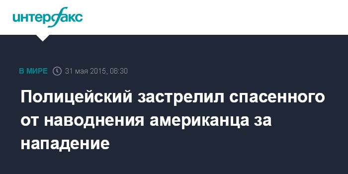 Москва. 31 мая. INTERFAX.RU - Полицейский в американском штате Оклахома застрелил мужчину, напавшего на него сразу после того, как стражи порядка помогли ему спастись от наводнения. Об этом сообщает BBC.