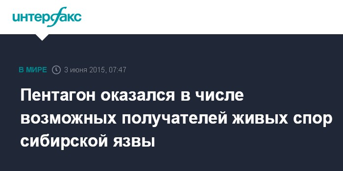 Москва. 3 июня. INTERFAX.RU - Военная медицинская лаборатория в штате Юта отправила споры сибирской язвы в том числе Пентагону. Об этом сообщает NBC.