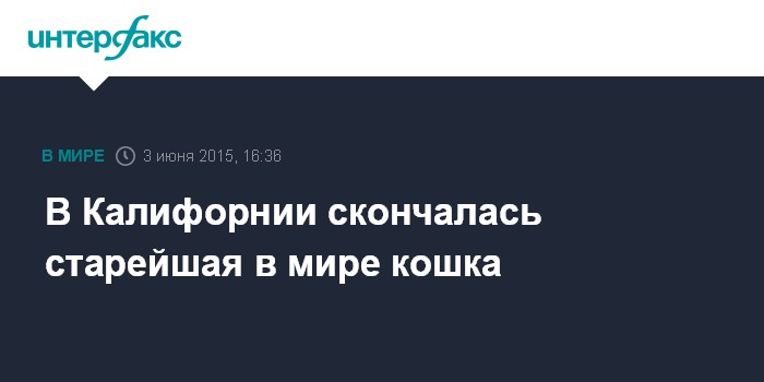 Москва. 3 июня. INTERFAX.RU - В американском городе Сан-Диего умерла кошка - обладательница титула самой старой среди живущих в мире.