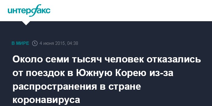 "Число отмененных поездок выросло с 2,5 тыс. в понедельник до 7 тыс. во вторник, большинство туристов из Китая и других азиатских регионов. Ожидается, что число отказов от поездок будет расти в связи увеличением случаев заражения заболеванием", - заявили журналистам в Национальной организации туризма Кореи.