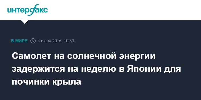Москва. 4 июня. INTERFAX.RU - Самолет на солнечной энергии Solar Impulse 2, совершающий кругосветное путешествие, задержится в японском городе Нагоя по меньшей мере на неделю для ремонта крыла, сообщил пилот Андре Боршберг.
