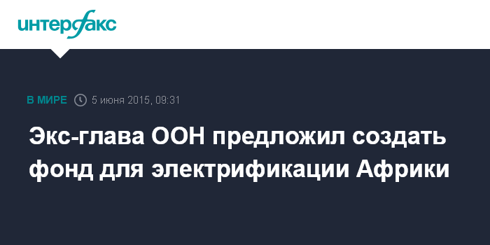 Москва. 5 июня. INTERFAX.RU - Бывший генсек ООН Кофи Аннан выступил с предложением создать фонд на сумму в несколько миллиардов долларов для помощи в снабжении африканских стран экологически чистыми видами энергии.