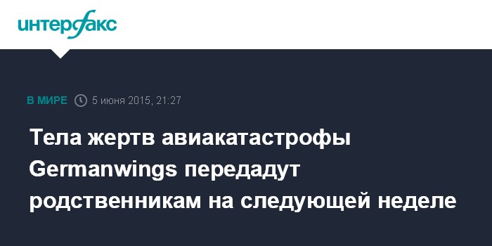 Москва. 5 июня. INTERFAX.RU – Тридцать родственников жертв катастрофы лайнера Germanwings, произошедшей в марте, получат тела для захоронений на следующей неделе, сообщает в пятницу агентство Associated Press, которое приводит выдержки из коммюнике авиакомпании Lufthansa, дочерней компанией которой является Germanwings.