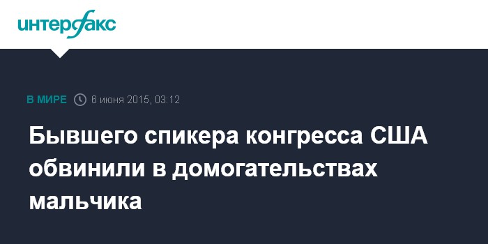 Москва. 6 июня. INTERFAX.RU - Бывшего спикера палаты представителей конгресса США Денниса Хастерта обвинили в домогательствах мальчика, сообщил в субботу телеканал SkyNews.
