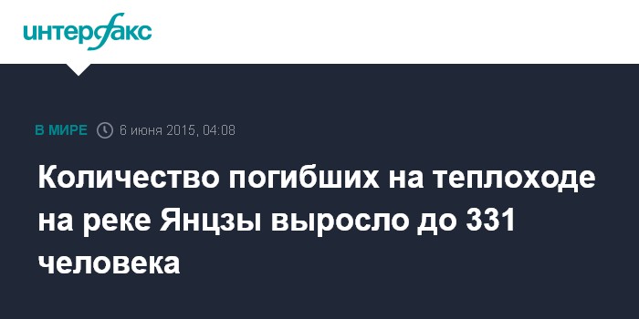 Москва. 6 июня. INTERFAX.RU - Число жертв крушения теплохода "Звезда Востока" на реке Янцзы с Китае возросло до 331, сообщило в субботу агентство "Синьхуа". 111 человек по-прежнему остаются в списках пропавших без вести.
