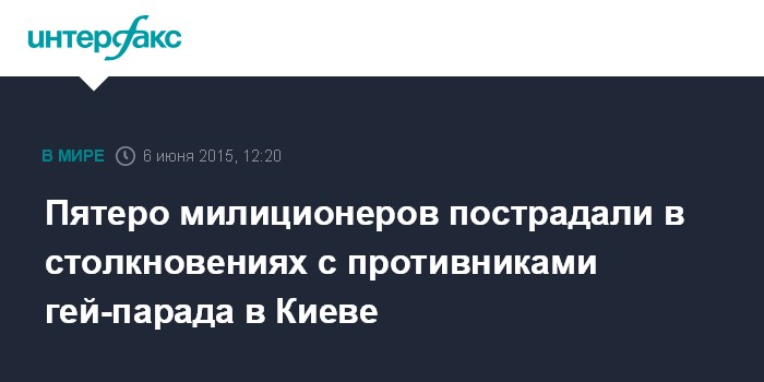 Москва. 6 июня. INTERFAX.RU - Пять сотрудников милиции пострадали во время столкновений в Киеве в субботу на Оболонской набережной во время проведения Марша равенства, организованного ЛГБТ.