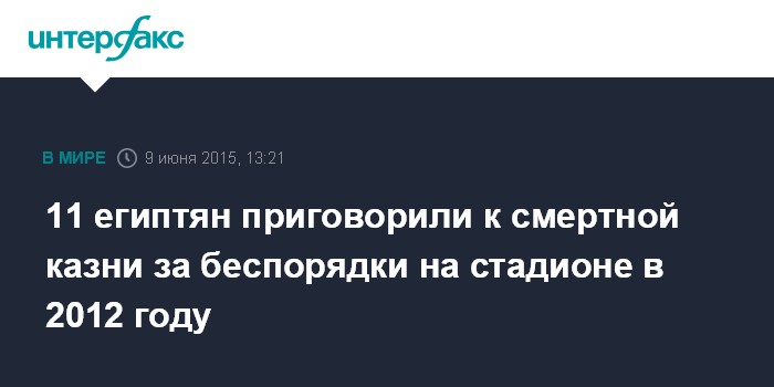 Москва. 9 июня. INTERFAX.RU - Суд в Египте вынес смертный приговор в отношении 11 участников по делу о давке на стадионе в Порт-Саиде в 2012 году, сообщают во вторник западные СМИ.