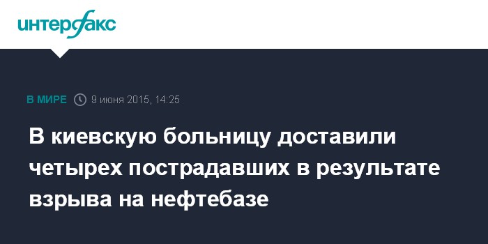 Москва. 9 июня. INTERFAX.RU - В Киевскую городскую клиническую больницу №2 направлены четверо пострадавших в результате пожара на нефтебазе под Киевом.