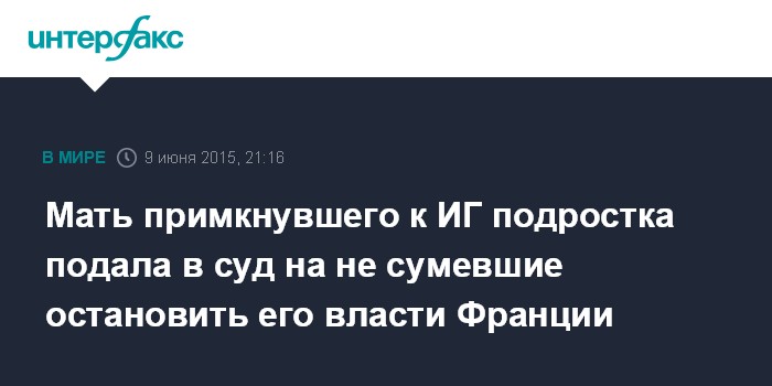 Москва. 9 июня. INTERFAX.RU - Жительница Франции направила жалобу в суд против властей страны, которые, по ее мнению, не сумели воспрепятствовать присоединению ее сына к боевикам из "Исламского государства" в Сирии, сообщают во вторник французские СМИ.