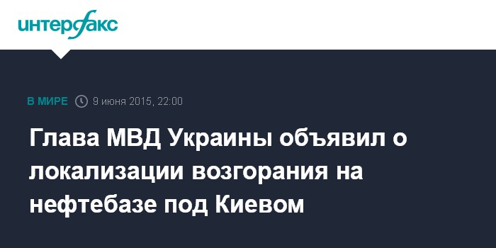 Москва. 9 июня. INTERFAX.RU - Сотрудники Госслужбы Украины по чрезвычайным ситуациям локализовали к вечеру вторника пожар на нефтебазе "БРСМ-нафта" в Васильковском районе Киевской области, информирует глава МВД Арсен Аваков.