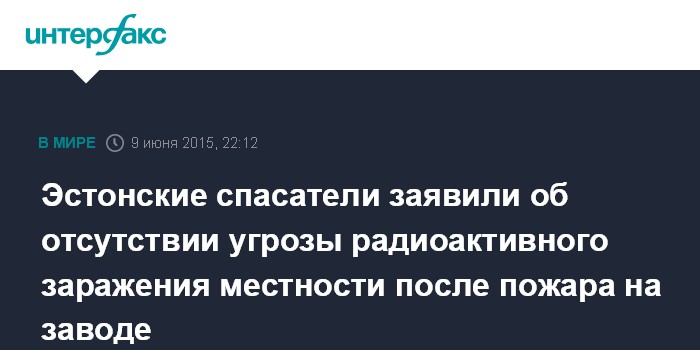 Москва. 9 июня. INTERFAX.RU - Эстонские спасатели заверяют, что угрозы радиоактивного заражения местности в связи с пожаром на заводе редкоземельных металлов Molycorp Silmet в городе Силламяэ (Sillamae) нет.