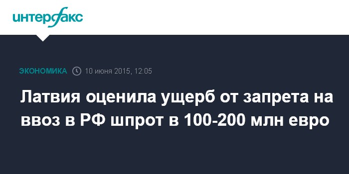 Москва. 10 июня. INTERFAX.RU – Убытки латвийских рыбопромышленников в результате решения России запретить импорт рыбных консервов из Латвии оцениваются в 100-200 млн евро, сообщил министр земледелия Янис Дуклавс.