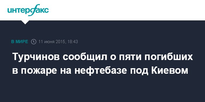 Москва. 11 июня. INTERFAX.RU - Секретарь СНБО Украины Александр Турчинов заявляет, что жертвами пожара на нефтебазе в Васильковской районе под Киевом стали пять человек.
