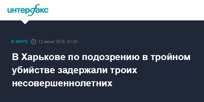 Москва. 12 июня. INTERFAX.RU - Правоохранители задержали в Харькове троих несовершеннолетних по подозрению в совершении тройного убийства. Об этом сообщает пресс-служба ГУ МВД Украины в Харьковской области.