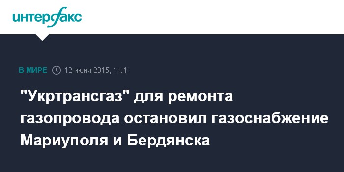 Москва. 12 июня. INTERFAX.RU - "Укртрансгаз" вынужденно отключил газоснабжение городов Волноваха, Мариуполь, Бердянск для ремонта поврежденного обстрелом магистрального газопровода Краматорск-Донецк в районе населенного пункта Очеретино.