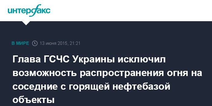 Москва. 13 июня. INTERFAX.RU - На нефтебазе "БРСМ-нафта" под Васильковом отсутствует угроза для распространения огня на территорию нефтебазы KLO и на военную базу, однако есть вероятность взрыва соседних резервуаров, сообщила пресс-служба Государственной службы Украины по чрезвычайным ситуациям в субботу вечером.