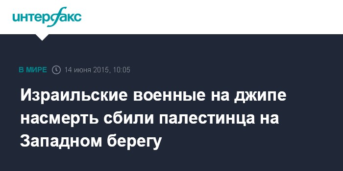 Москва. 14 июня. INTERFAX.RU - Солдаты армии обороны Израиля на военном джипе умышленно сбили палестинца в воскресенье в ходе столкновений между израильскими военными и палестинцами в районе города Рамалла на Западном берегу реки Иордан, сообщила палестинская служба безопасности.